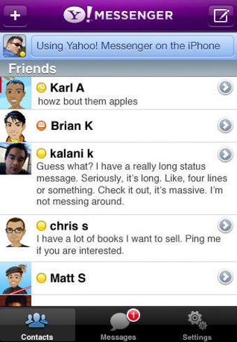 Yahoo! Messenger pour iPhone reprend les grandes fonctionnalités des versions de bureau, messagerie intantanée d'abord, qui permet de rester en contact avec ses amis connectés aussi sur la messagerie, même si cette version iPhone est la seule qui ne propose pas de connexion avec Windows Live Messenger...